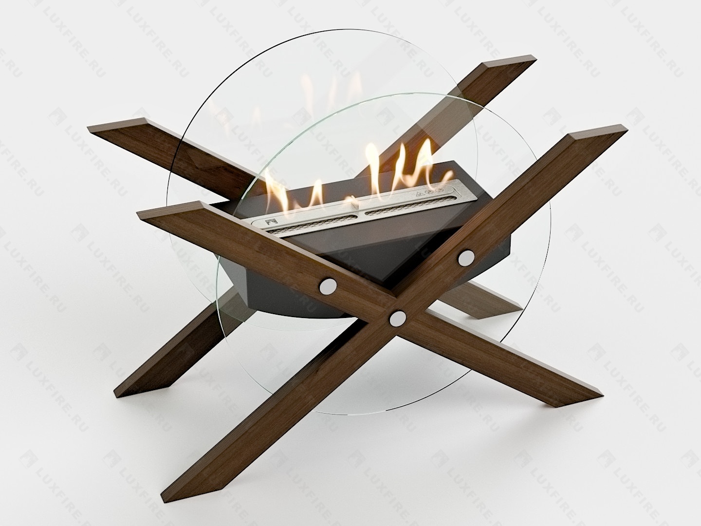 Представляет собой сборную модель оригинального авторского дизайна студии "Vontaren&Grinero" из закаленного стекла и топливного блока Luxfire 350 XS на подиуме, закрепленного на 4 дистанционных держателях. С деревянными натуральными накладками и обработанных огнебиозащитным средством.