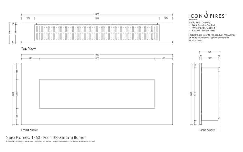 Настенный биокамин Nero 1450SS с декоративной рамкой из брашированной нержавеющей стали комплектуется горелкой ICON FIRES Slimline 1100mm.Камин изготовлен из стали с покрытием термостойкой краской.